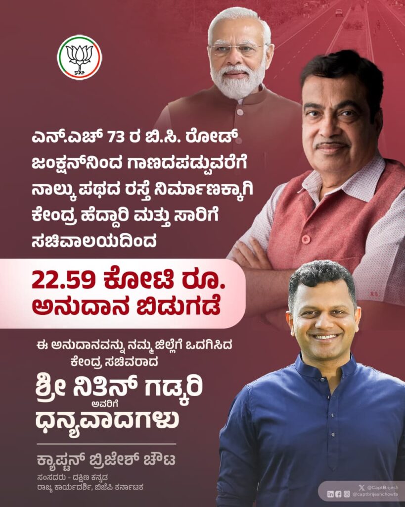 ಬಿ.ಸಿ. ರೋಡ್‌-ಪುಂಜಾಲಕಟ್ಟೆ ಸೇರಿ NH 73 ಹೆದ್ದಾರಿ ಅಭಿವೃದ್ಧಿಗೆ ಕೇಂದ್ರ ಸರ್ಕಾರದಿಂದ 64 ಕೋಟಿ ರೂ. ಮಂಜೂರು: ಸಂಸದ ಕ್ಯಾ.ಚೌಟ