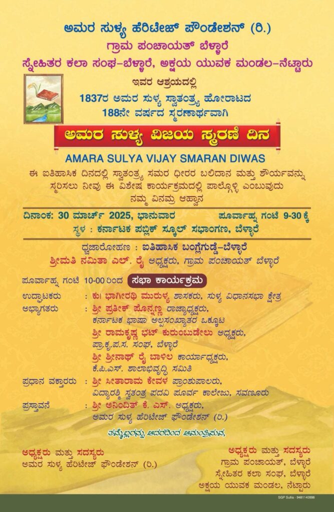 ಅಮರ ಸುಳ್ಯ ಹೆರಿಟೇಜ್ ಪೌಂಡೇಶನ್ (ರಿ.)ಗ್ರಾಮ ಪಂಚಾಯತ್ ಬೆಳ್ಳಾರೆ, ಸ್ನೇಹಿತರ ಕಲಾ ಸಂಘ-ಬೆಳ್ಳಾರೆ, ಅಕ್ಷಯ ಯುವಕ ಮಂಡಲ – ನೆಟ್ಟಾರು ಇವರ ಆಶ್ರಯದಲ್ಲಿ 1837ರ ಅಮರ ಸುಳ್ಯ
