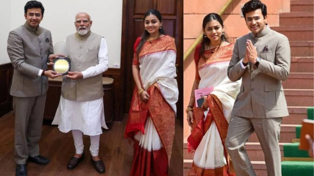 ಬೆಂಗಳೂರು ದಕ್ಷಿಣ ಕ್ಷೇತ್ರದ ಸಂಸದ ತೇಜಸ್ವಿ ಸೂರ್ಯ ಅವರು ಪತ್ನಿಯೊಂದಿಗೆ ಪ್ರಧಾನಿ ನರೇಂದ್ರ ಮೋದಿಯವರನ್ನುಭೇಟಿಯಾಗಿದ್ದಾರೆ ಚಿತ್ರಕೃಪೆ: ಎಕ್ಸ್ ಭೇಟಿಯ ವೇಳೆ ಮಧ್ವಾಚಾರ್ಯ ವಿರಚಿತ 750 ವರ್ಷಗಳ ಹಿಂದಿನ