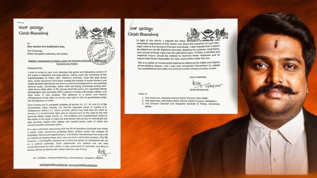 ದಕದಲ್ಲಿ ಪೊಲೀಸರಿಂದ ಕಿರುಕುಳ- ಪೊಲೀಸ್ ದೂರು ಪ್ರಾಧಿಕಾರಕ್ಕೆ ಪತ್ರ ಬರೆದ ನ್ಯಾಯವಾದಿ ಗಿರೀಶ್ ಭಾರದ್ವಾಜ್!ನ್ಯಾಯವಾದಿ ಗಿರೀಶ್ ಭಾರದ್ವಾಜ್ ಅವರು ಕರ್ನಾಟಕ ರಾಜ್ಯ ಪೊಲೀಸ್ ದೂರು ಪ್ರಾಧಿಕಾರದ ಅಧ್ಯಕ್ಷರಾದ
