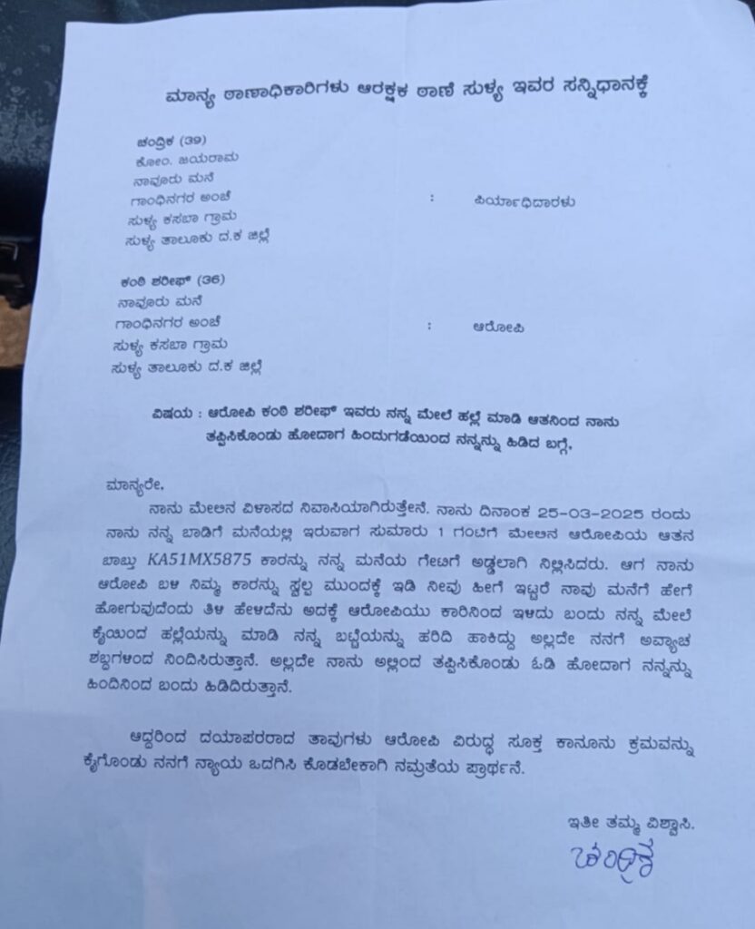 ನಗರ ಪಂಚಾಯತ್ ಸದಸ್ಯರಾಗಿರುವ ಶರೀಫ್ ಕಂಠಿ ಯವರು ಅವಾಚ್ಯ ಶಬ್ದಗಳಿಂದ ನಿಂಧಿಸಿ ಹಲ್ಲೆ ನಡೆಸಿದ್ದಾರೆಂದು ಮಹಿಳೆಯೊಬ್ಬರು ಸುಳ್ಯ ಠಾಣೆಗೆ ದೂರು ನೀಡಿದ್ದು ಶರೀಫ್ ಕಂಠಿ ವಿರುದ್ಧ ದೂರು