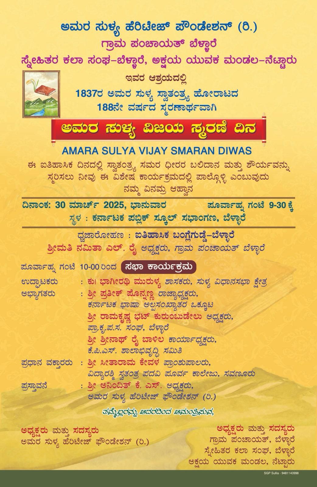 ಅಮರ ಸುಳ್ಯ ಹೆರಿಟೇಜ್ ಪೌಂಡೇಶನ್ (ರಿ.)ಗ್ರಾಮ ಪಂಚಾಯತ್ ಬೆಳ್ಳಾರೆ, ಸ್ನೇಹಿತರ ಕಲಾ ಸಂಘ-ಬೆಳ್ಳಾರೆ, ಅಕ್ಷಯ ಯುವಕ ಮಂಡಲ – ನೆಟ್ಟಾರು ಇವರ ಆಶ್ರಯದಲ್ಲಿ 1837ರ ಅಮರ ಸುಳ್ಯ ಸ್ವಾತಂತ್ರ್ಯ ಹೋರಾಟದ 188ನೇ ವರ್ಷದ ಸ್ಮರಣಾರ್ಥವಾಗಿ ಅಮರ ಸುಳ್ಯ ವಿಜಯ ಸ್ಮರಣೆ ದಿನ ಕಾರ್ಯಕ್ರಮವನ್ನು ಮಾರ್ಚ್ 30ರಂದು ಪೂರ್ವಾಹ್ನ 9 ಗಂಟೆಗೆ ಬೆಳ್ಳಾರೆ ಕರ್ನಾಟಕ ಪಬ್ಲಿಕ್ ಸ್ಕೂಲ್ ಸಭಾಂಗಣದಲ್ಲಿ ನಡೆಯಲಿದೆ.