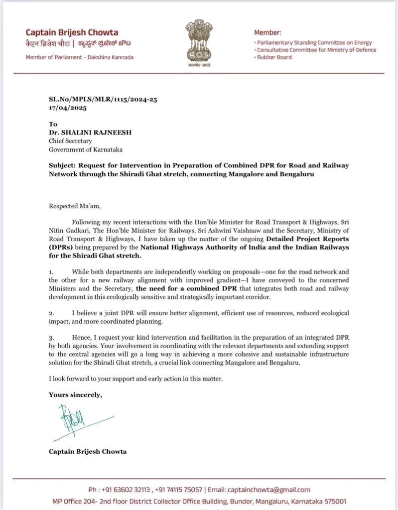 ಕರ್ನಾಟಕ ರಾಜ್ಯ ಸರ್ಕಾರದ ಮುಖ್ಯ ಕಾರ್ಯದರ್ಶಿ ಡಾ. ಶಾಲಿನಿ ರಜನೀಶ್ ಅವರನ್ನು ಇಂದು ಬೆಂಗಳೂರಿನಲ್ಲಿ ಸಂಸದ ಬ್ರಿಜೇಶ್ ಚೌಟ ಭೇಟಿಯಾದರು. ಮಂಗಳೂರು ಮತ್ತು ಬೆಂಗಳೂರನ್ನು ಸಂಪರ್ಕಿಸುವ ಪ್ರಮುಖ ಕೊಂಡಿಯಾಗಿರುವ ಶಿರಾಡಿ ಘಾಟ್ನ ಮೂಲಕ ರಸ್ತೆ ಮತ್ತು ರೈಲು ಅಭಿವೃದ್ಧಿಗಾಗಿ ಸಮಗ್ರ ಹಾಗೂ ಸಂಯೋಜಿತ ಡಿಪಿಆರ್ನ ಅಗತ್ಯತೆಯ ಬಗ್ಗೆ ಈ ಸಂದರ್ಭ ಚರ್ಚಿಸಲಾಯಿತು.