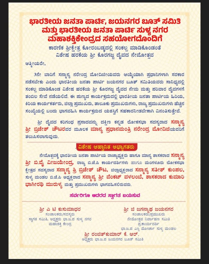 ಸುಳ್ಯ:ಪ್ರಧಾನ ಮಂತ್ರಿ ಶ್ರೀ ನರೇಂದ್ರ ಮೋದಿ ಮೂರನೇ ಬಾರಿ ಪ್ರಧಾನಿಯಾಗಿ ಅಧಿಕಾರ ನಡೆಸಬೇಕೆಂದು ಸುಳ್ಯ ಬಿಜೆಪಿ ಯ ಜಯನಗರ ಬೂತ್ ಸಮಿತಿ ಯವರು ಕೊರಗಜ್ಜ ಸಾನಿಧ್ಯದಲ್ಲಿ ಸಂಕಲ್ಪ ಮಾಡಿಕೊಂಡು ವಿಶೇಷ ಹರಕೆಯ ಕೊರಗಜ್ಜ ದೈವದ ನೇಮ ಮತ್ತು ಪರಿವಾರ ದೈವಗಳಿಗೆ ತಂಬಿಲ ಸೇವೆ ಮೇ 17 ರಂದು ಜಯನಗರದಲ್ಲಿ ನಡೆಯಲಿದೆ.
