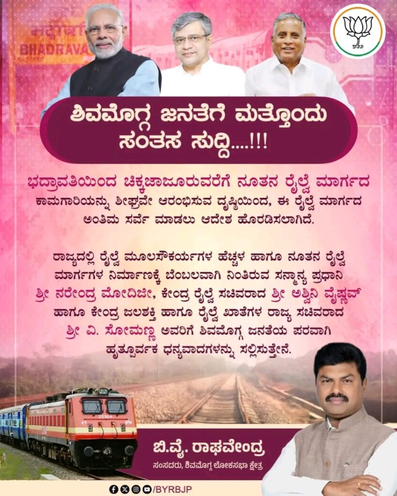 ಶಿವಮೊಗ್ಗ ಜನತೆಗೆ ಮತ್ತೊಂದು ಸಂತಸ ಸುದ್ದಿ….!!! ಭದ್ರಾವತಿಯಿಂದ ಚಿಕ್ಕಜಾಜೂರುವರೆಗೆ ನೂತನ ರೈಲ್ವೆ ಮಾರ್ಗದ ಕಾಮಗಾರಿಯನ್ನು ಶೀಘ್ರವೇ ಆರಂಭಿಸುವ ದೃಷ್ಠಿಯಿಂದ, ಈ ರೈಲ್ವೆ ಮಾರ್ಗದ ಅಂತಿಮ ಸರ್ವೆ ಮಾಡಲು ಆದೇಶ ಹೊರಡಿಸಲಾಗಿದೆ.ಈ ಒಂದು ಹೊಸ ಮೈಲಿಗಲ್ಲು ಸ್ಥಾಪಿತವಾದ ನಂತರ ನಮ್ಮ ಮಲೆನಾಡು ಭಾಗಕ್ಕೆ ಬಯಲು ಸೀಮೆ ಹಾಗೂ ಅರೆ ಮಲೆನಾಡು ಭಾಗಗಳ ಸಂಪರ್ಕ ಸಾಧ್ಯತೆಯಿಂದ ವ್ಯಾಪಾರ, ವ್ಯವಹಾರ, ಪ್ರವಾಸೋದ್ಯಮ, ಕೈಗಾರಿಕೆ ಹಾಗೂ ವಾಣಿಜ್ಯೋದ್ಯಮಕ್ಕೆ ಹೆಚ್ಚಿನ ಬಲ ದೊರೆಯುತ್ತದೆ ಇದರೊಂದಿಗೆ ಮಲೆನಾಡಿನ ಆರ್ಥಿಕ ಅಭಿವೃದ್ಧಿಗೆ ಪೂರಕ ವಾತಾವರಣ ನಿರ್ಮಾಣವಾಗುತ್ತದೆ.ಜೊತೆಗೆ ಮಲೆನಾಡಿಗೆ ರಾಜ್ಯದ ಎಲ್ಲಾ ಮೂಲೆಗಳಿಗೆ ಉತ್ತಮ ಸಂಪರ್ಕ ದೊರೆಯುವ ಮೂಲಕ ಜನಸಾಮಾನ್ಯರ ಆರ್ಥಿಕ, ಸಾಮಾಜಿಕ ಹಾಗೂ ಶೈಕ್ಷಣಿಕವಾಗಿ ಅಭಿವೃದ್ಧಿ ಹೊಂದಲು ಪೂರಕವಾಗುತ್ತದೆ. ಬಂಡವಾಳ ಹೂಡಿಕೆಗೆ ಉತ್ತಮ ವಾತಾವರಣ ಕೂಡ ನಿರ್ಮಾಣವಾಗುತ್ತದೆ. ಈ ಎಲ್ಲ ದೂರದೃಷ್ಟಿ ಇಟ್ಟುಕೊಂಡು ರಾಜ್ಯದಲ್ಲಿ ರೈಲ್ವೆ ಮೂಲಸೌಕರ್ಯಗಳ ಹೆಚ್ಚಳ ಹಾಗೂ ನೂತನ ರೈಲ್ವೆ ಮಾರ್ಗಗಳ ನಿರ್ಮಾಣಕ್ಕೆ ಬೆಂಬಲವಾಗಿ ನಿಂತಿರುವ ಸನ್ಮಾನ್ಯ ಪ್ರಧಾನಿ ಶ್ರೀ ನರೇಂದ್ರ ಮೋದಿಜೀ, ಕೇಂದ್ರ ರೈಲ್ವೆ ಸಚಿವರಾದ ಶ್ರೀ ಅಶ್ವಿನಿ ವೈಷ್ಣವ್ ಹಾಗೂ ಕೇಂದ್ರ ಜಲಶಕ್ತಿ ಹಾಗೂ ರೈಲ್ವೆ ಖಾತೆಗಳ ರಾಜ್ಯ ಸಚಿವರಾದ ಶ್ರೀ ವಿ. ಸೋಮಣ್ಣ ಅವರಿಗೆ ಶಿವಮೊಗ್ಗ ಜನತೆಯ ಪರವಾಗಿ ಸಂಸದ ಬಿವೈ ರಾಘವೇಂದ್ರ ಹೃತ್ಪೂರ್ವಕ ಧನ್ಯವಾದಗಳನ್ನು ಸಲ್ಲಿಸಿದ್ದಾರೆ
