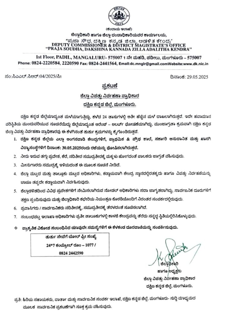 ದ.ಕ.ಜಿಲ್ಲೆಯಾದ್ಯಂತ ಭಾರಿ ಮಳೆ ಸುರಿಯುತ್ತಿದ್ದು, ಮುನ್ನೆಚ್ಚರಿಕೆಯ ಸಲುವಾಗಿ ದ.ಕ.ಜಿಲ್ಲೆಯ ಅಂಗನವಾಡಿ, ಪ್ರಾಥಮಿಕ ಮತ್ತು ಪ್ರೌಢಶಾಲೆ,ಸರಕಾರಿ ಅನುದಾನಿತ, ಖಾಸಗಿ ಶಾಲೆಗಳಿಗೆ ರಜೆ ಘೋಷಣೆ ಮಾಡಿ ದ.ಕ. ಜಿಲ್ಲಾಧಿಕಾರಿ ಆದೇಶ ಹೊರಡಿಸಿದ್ದಾರೆ.