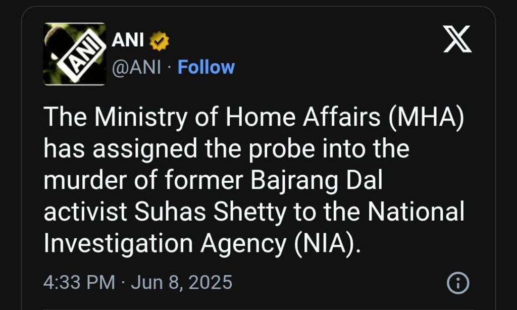 ಹಿಂದೂಪರ ಸಂಘಟನೆಗಳ ಕಾರ್ಯಕರ್ತ ಮಂಗಳೂರಿನ ಸುಹಾಸ್ ಶೆಟ್ಟಿ ಹತ್ಯೆ ಪ್ರಕಣವನ್ನು ಕೇಂದ್ರ ಗೃಹ ಇಲಾಖೆ ರಾಷ್ಟ್ರೀಯ ತನಿಖಾ ದಳಕ್ಕೆ (ಎನ್ಐಎ) ಒಪ್ಪಿಸಿದೆ.ಈ ಕುರಿತು ಇಂದು ಕೇಂದ್ರ ಗೃಹ ಇಲಾಖೆ ಆದೇಶ ಮಾಡಿದೆ ಎಂದು ಸುದ್ದಿಸಂಸ್ಥೆ ಎಎನ್ಐ ಎಕ್ಸ್ ಪೋಸ್ಟ್ ಮಾಡಿದೆ.