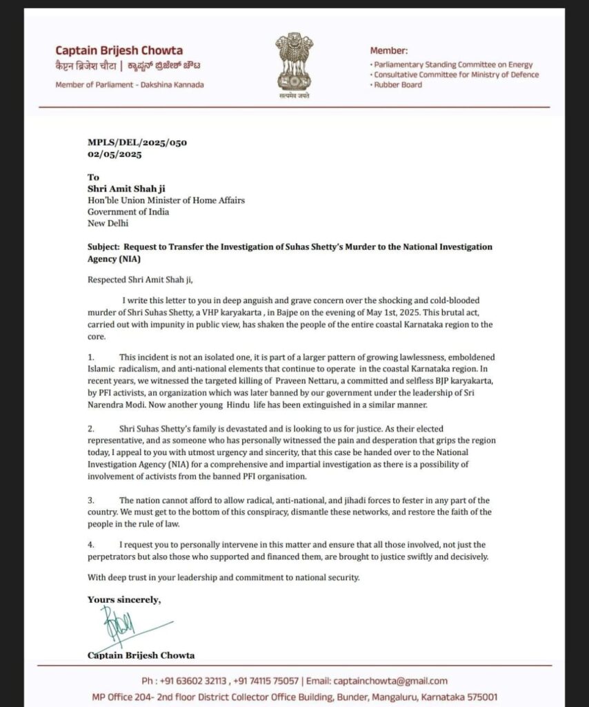 ಅವರ ಚುನಾಯಿತ ಪ್ರತಿನಿಧಿಯಾಗಿ ಮತ್ತು ಇಂದು ಈ ಪ್ರದೇಶವನ್ನು ಆವರಿಸಿರುವ ನೋವು ಮತ್ತು ಹತಾಶೆಯನ್ನು ವೈಯಕ್ತಿಕವಾಗಿ ಕಂಡ ವ್ಯಕ್ತಿಯಾಗಿ, ನಿಷೇಧಿತ ಪಿಎಫ್ಐ ಸಂಘಟನೆಯ ಕಾರ್ಯಕರ್ತರು ಭಾಗಿಯಾಗಿರುವ ಸಾಧ್ಯತೆ ಇರುವುದರಿಂದ ಸಮಗ್ರ ಮತ್ತು ನಿಷ್ಪಕ್ಷಪಾತ ತನಿಖೆಗಾಗಿ ಈ ಪ್ರಕರಣವನ್ನು ರಾಷ್ಟ್ರೀಯ ತನಿಖಾ ಸಂಸ್ಥೆ (ಎನ್ಐಎ)ಗೆ ಹಸ್ತಾಂತರಿಸಬೇಕೆಂದು ಈ ಹಿಂದೆ ಸಂಸದ ಕ್ಯಾ.ಬ್ರಿಜೇಶ್ ಚೌಟ ಕೇಂದ್ರ ಗೃಹ ಸಚಿವ ಅಮಿತ್ ಶಾ ರವರಿಗೆ ಪತ್ರ ಮುಖೇನ ಈ ಹಿಂದೆ ಒತ್ತಾಯಿಸಿದ್ದರು.