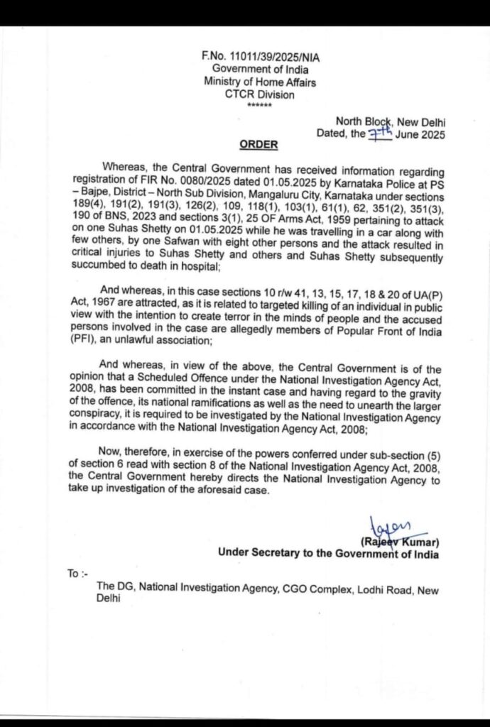 ಹಿಂದೂ ಕಾರ್ಯಕರ್ತ ಸುಹಾಸ್ ಶೆಟ್ಟಿ ಹತ್ಯೆ ವಿಚಾರದಲ್ಲಿ ಕೇಂದ್ರ ಸರ್ಕಾರ ಮಧ್ಯಪ್ರವೇಶಿಸಿದ್ದು ಎನ್ ಐಎ ಗೆ ಹಸ್ತಾಂತರಿಸಿ ಕೇಂದ್ರ ಗೃಹ ಇಲಾಖೆ ಅದೇಶಿಸಿರುವುದನ್ನು ಸಂಸದ ಕ್ಯಾ.ಬ್ರಿಜೇಶ್ ಚೌಟ ಕೇಂದ್ರ ಸರ್ಕಾರ ಗೃಹ ಮಂತ್ರಿ ಅಮಿತ್ ಶಾ ಮತ್ತು ಸರ್ಕಾರವನ್ನು ಅಭಿನಂದಿಸಿದ್ದಾರೆ.