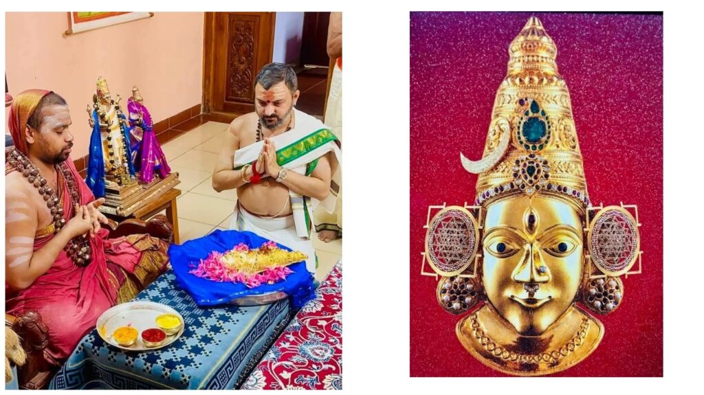 ಕೊಲ್ಲೂರು ಶ್ರೀ ಮೂಕಾಂಬಿಕಾ ದೇವಿಗೆ ಶಿರಾ ಮೂಲದ ಭಕ್ತರಾದ ಲಕ್ಷ್ಮೀನಾರಾಯಣ ಅವರು ಸೇವಾ ರೂಪದಲ್ಲಿ ಬಂಗಾರದ ಮುಖವಾಡವನ್ನು ಶೃಂಗೇರಿ ಜಗದ್ಗುರು ಶ್ರೀ ಶ್ರೀ ವಿಧುಶೇಖರ ಭಾರತೀ ಮಹಾಸ್ವಾಮಿಗಳ ಅಮೃತಹಸ್ತದಿಂದ ಪ್ರಥಮ ಪೂಜೆ ನೆರವೇರಿಸಿ,ನಂತರ ಕೊಲ್ಲೂರು ಶ್ರೀ ದೇವಿಗೆ ಸಮರ್ಪಿಸಿದ್ದಾರೆ.
