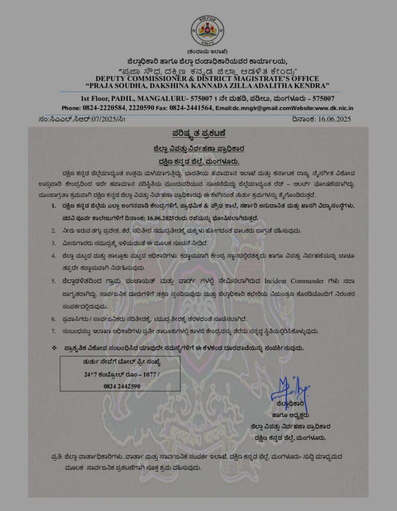 ಜೂ.15ರಂದು ಸಂಜೆ ಹೊರಡಿಸಿದ ಆದೇಶದಲ್ಲಿ ಸುಳ್ಯ, ಪುತ್ತೂರು, ಬೆಳ್ತಂಗಡಿ, ಕಡಬ ತಾಲೂಕು ಹೊರತು ಪಡಿಸಿ ಜಿಲ್ಲೆಯ ಇತರ ತಾಲೂಕಿಗೆ ರಜೆ ಎಂದು ಆದೇಶ ಮಾಡಲಾಗಿತ್ತು.