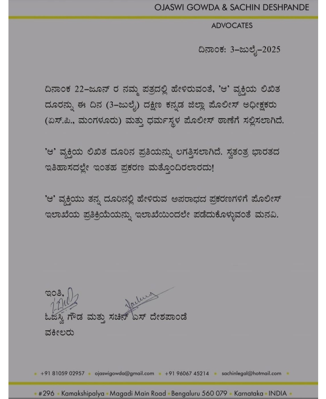 ಧರ್ಮಸ್ಥಳ: ಧರ್ಮಸ್ಥಳ ಗ್ರಾಮದಲ್ಲಿ ಹಲವಾರು ಮೃತದೇಹಗಳನ್ನು ಹೂತು ಹಾಕಿರುವುದಾಗಿ ವಕೀಲರು ಮೂಲಕ ಹೇಳಿಕೆ ನೀಡುತ್ತಿದ್ದ ಪಾಪ ಪ್ರಜ್ಞೆ ಕಾಡಿದ ವ್ಯಕ್ತಿ ಜು.3 ರಂದು ದಕ್ಷಿಣ ಕನ್ನಡ ಜಿಲ್ಲಾ ಪೊಲೀಸ್ ವರಿಷ್ಠಾಧಿಕಾರಿಯವರ ಕಚೇರಿಗೆ ಬಂದು ದೂರು ನೀಡಿರುವುದಾಗಿ ವಕೀಲರಾದ ಓಜಸ್ವಿ ಗೌಡ ಮತ್ತು ಸಚಿನ್ ಎಸ್ ದೇಶಪಾಂಡೆ ಪತ್ರ ವೈರಲ್ ಮಾಡಿದ್ದಾರೆ.ಈ ಪ್ರಕರಣದ ಬಗ್ಗೆ ಎಸ್ಪಿ ಕಚೇರಿಗೆ ಮತ್ತು ಧರ್ಮಸ್ಥಳ ಪೊಲೀಸ್ ಠಾಣೆಗೆ ವ್ಯಕ್ತಿಯಿಂದ ದೂರು ಸಲ್ಲಿಕೆಯಾಗಿದ್ದು ವಿಚಾರಣೆ ಮಾಡಿ ಮುಂದಿನ ಕಾನೂನು ಕ್ರಮ ಕೈಗೊಳ್ಳಲಾಗುವುದು ಎಂದು ಪೊಲೀಸ್ ಇಲಾಖೆಯಿಂದ ಪತ್ರಿಕಾ ಪ್ರಕಟಣೆ ಹೊರಡಿಸಿದ್ದಾರೆ.ವಕೀಲರು ಹೊರಡಿಸಿರುವ ಪತ್ರದಲ್ಲಿ ಪಾಪ ಪ್ರಜ್ಞೆ ಕಾಡಿದ ವ್ಯಕ್ತಿ ಹಲವಾರು ಕೊಲೆ, ಅತ್ಯಾಚಾರ ಮಾಡಿದ ಮೃತದೇಹಗಳನ್ನು ಹೂತು ಹಾಕಿದ್ದು ಅದನ್ನು ಪೊಲೀಸರು ಪ್ರಕರಣ ದಾಖಲಿಸಿ ಆತನಿಗೆ ಭದ್ರತೆ ನೀಡಿಬೇಕು ಬಳಿಕ ಎಲ್ಲಾ ಹೂತು ಹಾಕಿದ ಮೃತದೇಹ ಪೊಲೀಸರಿಗೆ ಗೌಪ್ಯವಾಗಿ ತೊರಿಸಿಕೊಡುತ್ತೇನೆ.ಅದಲ್ಲದೆ ಇತ್ತಿಚೆಗೆ ಗೌಪ್ಯವಾಗಿ ಬಂದು ಹೂತು ಹಾಕಿದ ಮೃತದೇಹದ ಕಳೇಬರ ಹೊರತೆಗೆದಿದ್ದಾಗಿ ಹೇಳಿದ್ದಾನೆ ಎನ್ನಲಾಗಿದೆ.