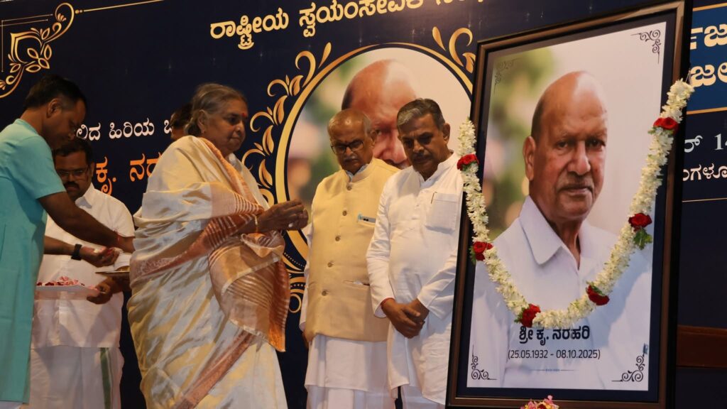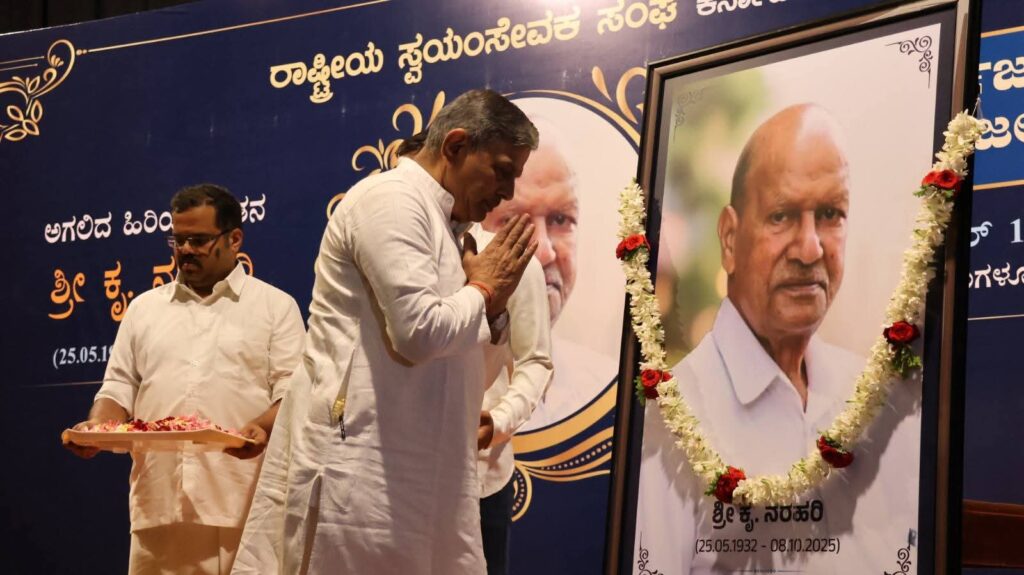 ಬೆಂಗಳೂರು: ರಾಷ್ಟ್ರೀಯ ಸ್ವಯಂಸೇವಕ ಸಂಘದ ವತಿಯಿಂದ ಆಯೋಜಿಸಲಾದ ಜ್ಯೇಷ್ಠ ಕಾರ್ಯಕರ್ತ, ವಿಧಾನ ಪರಿಷತ್ ಮಾಜಿ ಸದಸ್ಯ, ಶಿಕ್ಷಣತಜ್ಞ ಶ್ರೀ ಕೃ.ನರಹರಿ ಅವರ ಶ್ರದ್ಧಾಂಜಲಿ ಸಭೆಯಲ್ಲಿ ರಾಷ್ಟ್ರೀಯ ಸ್ವಯಂಸೇವಕ ಸಂಘದ ಸರಕಾರ್ಯವಾಹ ದತ್ತಾತ್ರೇಯ ಹೊಸಬಾಳೆ, ರಾಷ್ಟ್ರ ಸೇವಿಕಾ ಸಮಿತಿಯ ಪ್ರಮುಖ ಸಂಚಾಲಿಕಾ ವಿ.ಶಾಂತಾಕುಮಾರಿ, ಶಿಕ್ಷಣತಜ್ಞ ಡಾ॥ ಎವಿಎಸ್ ಮೂರ್ತಿ, ಚನ್ನೇನಹಳ್ಳಿ ಜನಸೇವಾ ವಿದ್ಯಾಕೇಂದ್ರದ ವಿಶ್ವಸ್ಥ ಮಂಡಳಿಯ ಗೌರವ ಕಾರ್ಯದರ್ಶಿ ನಿರ್ಮಲ್ ಕುಮಾರ್,