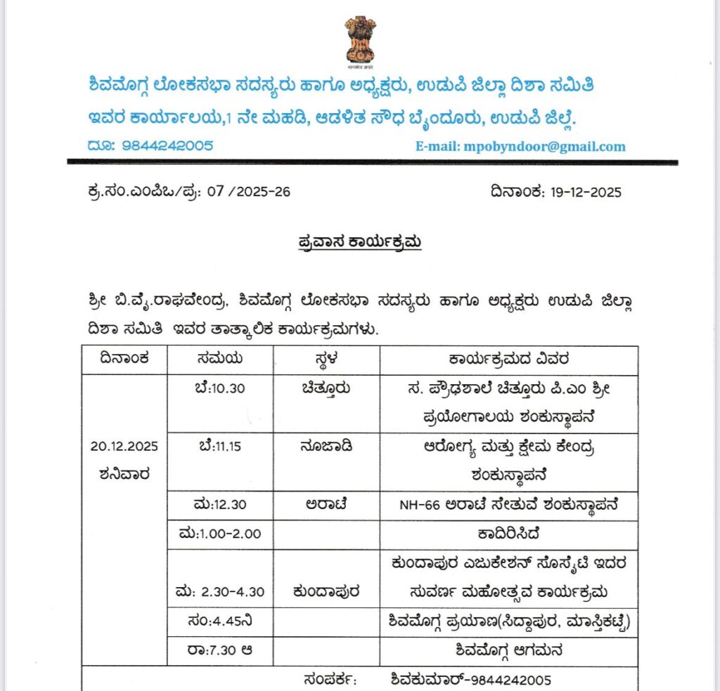 ಮಧ್ಯಾಹ್ನ 2.30-4.30ಕುಂದಾಪುರ ಎಜುಕೇಶನ್ ಸೊಸೈಟಿ ಇದರ ಸುವರ್ಣ ಮಹೋತ್ಸವ ಕಾರ್ಯಕ್ರಮ ಭಾಗವಹಿಸಿ ಶಿವಮೊಗ್ಗ ಪ್ರಯಾಣ(ಸಿದ್ದಾಪುರ, ಮಾಸ್ತಿಕಟ್ಟೆ )ಲಿದ್ದಾರೆಂದು ಸಂಸದರ ಅಪ್ತ ಸಹಾಯಕ ಶಿವಕುಮಾರ್ ಮಾಹಿತಿ ನೀಡಿದ್ದಾರೆ