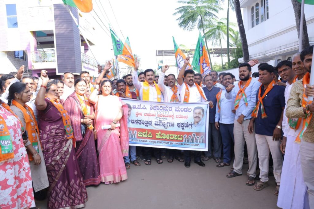 ಶಿಕಾರಿಪುರ ತಾಲೂಕು ಕಚೇರಿ ಮುಂಭಾಗ ನಡೆದ ಈ ಪ್ರತಿಭಟನೆಯಲ್ಲಿ ಸಾವಿರಾರು ಕಾರ್ಯಕರ್ತರು ಭಾಗವಹಿಸಿದರು.