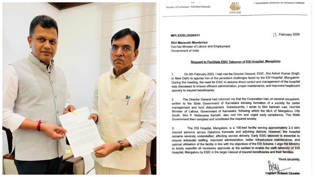 ನವದೆಹಲಿ: ಮಂಗಳೂರಿನ ಇಎಸ್ಐ ಆಸ್ಪತ್ರೆಯನ್ನು ನೇರವಾಗಿ ಇಎಸ್ಐಸಿ (ESIC) ತನ್ನ ಸುಪರ್ದಿಗೆ ಪಡೆಯುವ ಪ್ರಕ್ರಿಯೆಯನ್ನು ತ್ವರಿತಗೊಳಿಸುವಂತೆ ಕೋರಿ ದಕ್ಷಿಣ ಕನ್ನಡ ಸಂಸದ ಕ್ಯಾ. ಬ್ರಿಜೇಶ್ ಚೌಟ ಅವರು ಕೇಂದ್ರ ಕಾರ್ಮಿಕ ಸಚಿವ ಮನ್ಸುಖ್ ಮಾಂಡವೀಯ ಅವರಿಗೆ ಮನವಿ ಮಾಡಿದ್ದಾರೆ.
