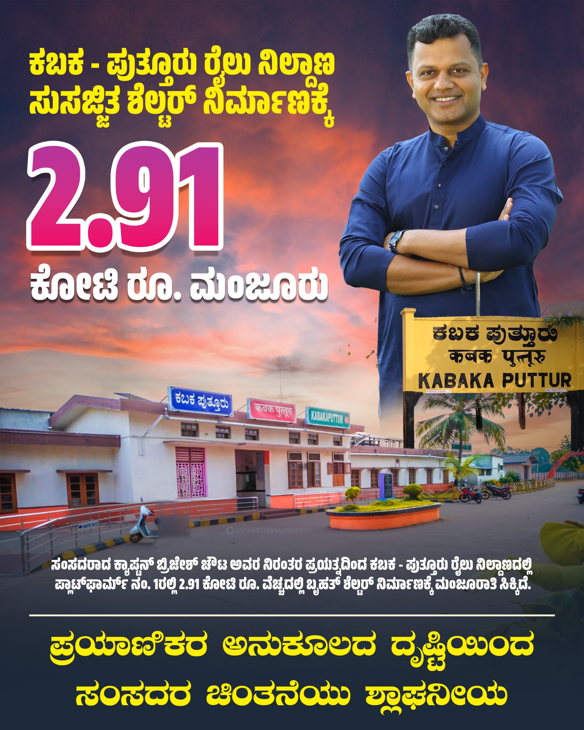 ಕಬಕ ಪುತ್ತೂರು ರೈಲು ನಿಲ್ದಾಣದ ಅಭಿವೃದ್ದಿಯ ಅಗತ್ಯತೆಯನ್ನು ಮನಗಂಡಿದ್ದ ಸಂಸದ ಕ್ಯಾ. ಬ್ರಿಜೇಶ್ ಚೌಟ ಅವರು, 2024ರ ನವೆಂಬರ್ ನಲ್ಲಿ ನೈಋತ್ಯ ರೈಲ್ವೆಯ ಜನರಲ್ ಮ್ಯಾನೇಜರ್ ಗೆ ಪತ್ರ ಬರೆದು ಶೆಲ್ಟರ್ ವಿಸ್ತರಿಸಲು ಕ್ರಮ ಕೈಗೊಳ್ಳುವಂತೆ ಕೋರಿದ್ದರು. ಈ ಭಾಗದ ಪ್ರಯಾಣಿಕರು ಬೇಸಿಗೆಯಲ್ಲಿ ತೀವ್ರ ಬಿಸಿಲಿನಿಂದ ಹಾಗೂ ಮಳೆಗಾಲದಲ್ಲಿ ನೆನೆಯುತ್ತಾ ರೈಲು ಹತ್ತಬೇಕಾದ ಕಷ್ಟಕರ ಪರಿಸ್ಥಿತಿಯನ್ನು ಅವರು ರೈಲ್ವೆ ಇಲಾಖೆ ಗಮನಕ್ಕೆ ತಂದಿದ್ದರು. ಪ್ರತಿಕೂಲ ವಾತಾವರಣದಿಂದ ಪ್ರಯಾಣಿಕರಿಗೆ ಎದುರಾಗುತ್ತಿದ್ದ ಸಮಸ್ಯೆಯನ್ನು ಗಂಭೀರವಾಗಿ ಪರಿಗಣಿಸಿದ್ದ ಕ್ಯಾ. ಚೌಟ ಅವರು ಪ್ಲಾಟ್ಫಾರ್ಮ್ ಶೆಲ್ಟರ್ ವಿಸ್ತರಣೆ ಅಗತ್ಯತೆಯನ್ನು ಮನಗಂಡು ಈ ನಿಟ್ಟಿನಲ್ಲಿ ರೈಲ್ವೆ ಇಲಾಖೆಯು ಆದ್ಯತೆ ಮೇಲೆ ಅಗತ್ಯ ಅನುದಾನ ಬಿಡುಗಡೆಗೆ ಪ್ರಯತ್ನಿಸಿದ್ದರು. ಅದರಂತೆ ಇದೀಗ ರೈಲು ನಿಲ್ದಾಣದ ಅಭಿವೃದ್ದಿಗೆ ಅನುದಾನ ಮಂಜೂರು ಮಾಡಿರುವುದಕ್ಕೆ ಪ್ರಧಾನಮಂತ್ರಿ ನರೇಂದ್ರ ಮೋದಿ, ರೈಲ್ವೇ ಸಚಿವರಾದ ಅಶ್ವಿನಿ ವೈಷ್ಣವ್, ವಿ. ಸೋಮಣ್ಣ ಮತ್ತು ರೈಲ್ವೇ ಇಲಾಖೆಗೆ ಪ್ರಯಾಣಿಕರು ಹಾಗೂ ರೈಲ್ವೆ ಬಳಕೆದಾರರ ಸಂಘದ ಪರವಾಗಿ ಸಂಸದರು ಧನ್ಯವಾದ ಸಲ್ಲಿಸಿದ್ದಾರೆ.